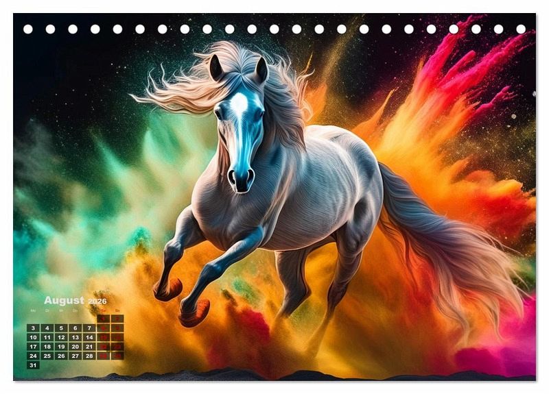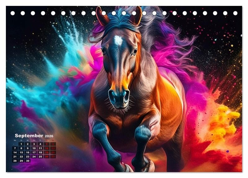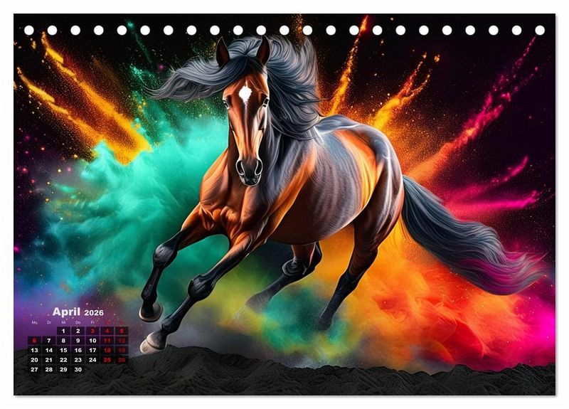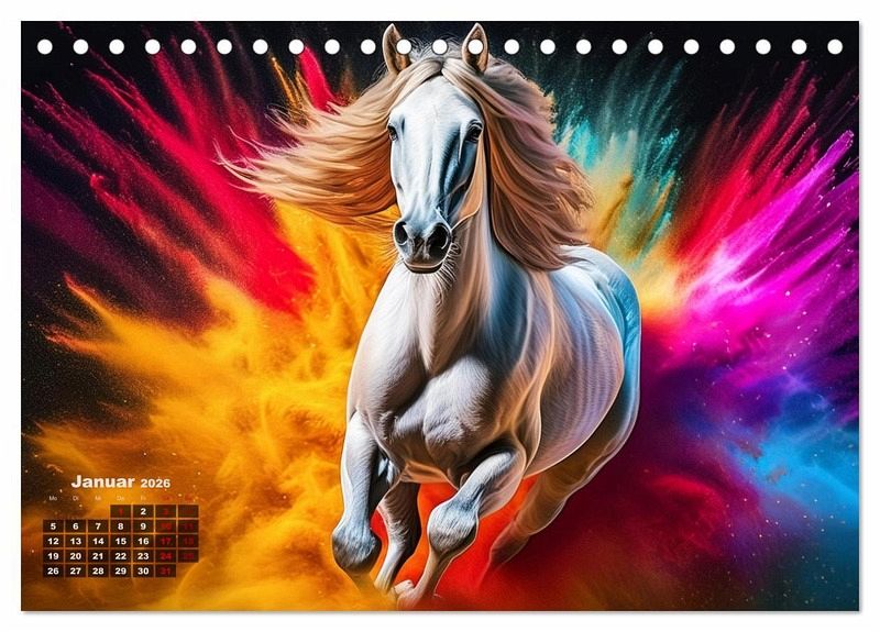 Tauche ein in die Welt der lebendigen Farben und der majestätischen Pferde! Der Kalender "Pferde im Farbenrausch" ist eine Hommage an die Schönheit und Energie dieser faszinierenden Tiere. Jedes KI generierte Bild zeigt ein anderes Pferd, das von Holi-Pulver umhüllt ist. Die Farben leuchten, die Mähne fliegt im Wind - ein visuelles Fest für die Sinne! Die Bilder entstanden nach Fotografien von Verena Scholze, die sich auf Holi Pulver Shootings spezialisiert hat. Ob für Pferdeliebhaber, Kunstenthusiasten oder einfach für dich selbst - lass dich von der Magie der Farben und kraftvollen Pferde verzaubern.