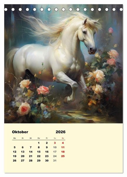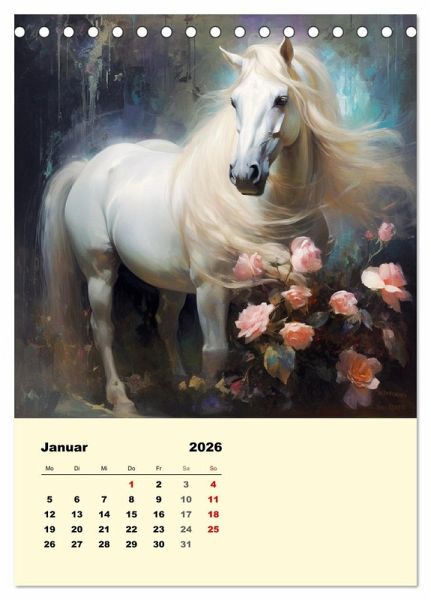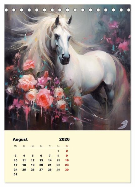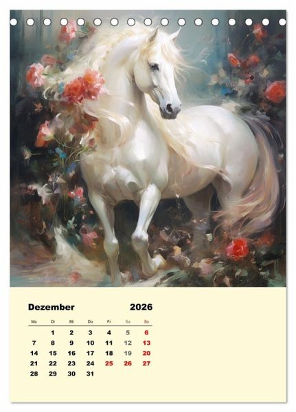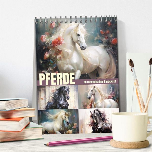 Pferde Gemälde sind eine zeitlose und elegante Dekoration, die nicht nur Pferdeliebhaber begeistert. Pferde sind würdevoll und majestätisch und dieser Kalender spiegelt ihre unglaubliche Schönheit wider. Diese romantisch-verträumten Pferdebilder wurden mit KI erstellt und bringen Freude in jedes Heim.