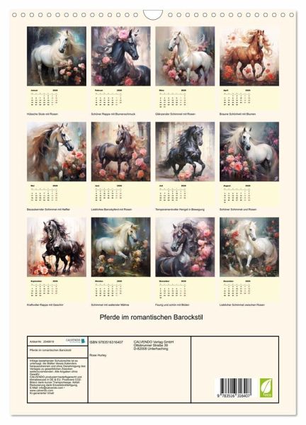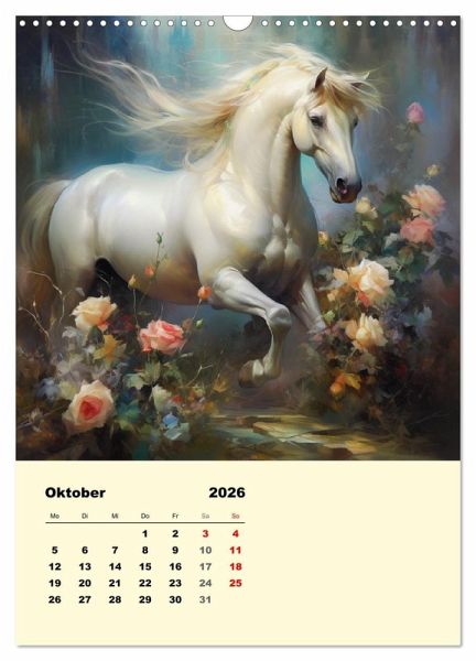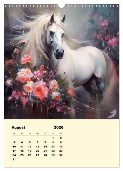 Pferde Gemälde sind eine zeitlose und elegante Dekoration, die nicht nur Pferdeliebhaber begeistert. Pferde sind würdevoll und majestätisch und dieser Kalender spiegelt ihre unglaubliche Schönheit wider. Diese romantisch-verträumten Pferdebilder wurden mit KI erstellt und bringen Freude in jedes Heim.