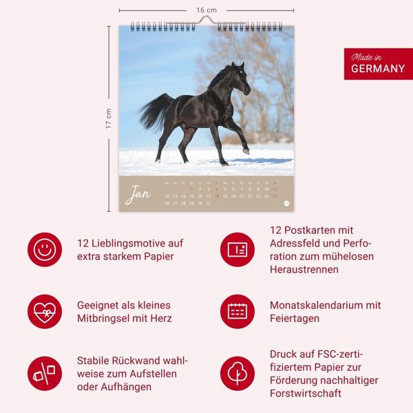 - Majestätische Pferde und übermütige Fohlen: Dieser Kalender zum Aufstellen oder Aufhängen ist ein Muss für Pferdeliebhaber:innen - Der Pferdekalender von Sabine Stuewer zeigt die schönen Tiere in hochwertigen Aufnahmen- Zwölfmal traumhafte Pferde-Fotografie in einem Postkartenkalender im Format 16 x 17 cm- Ein schönes Geschenk für Reiter:innen: Der kleine Kalender findet überall ein Plätzchen- Kalender für Tierfreund:innen: Bei Heye im Athesia Kalenderverlag finden Sie das Passende!