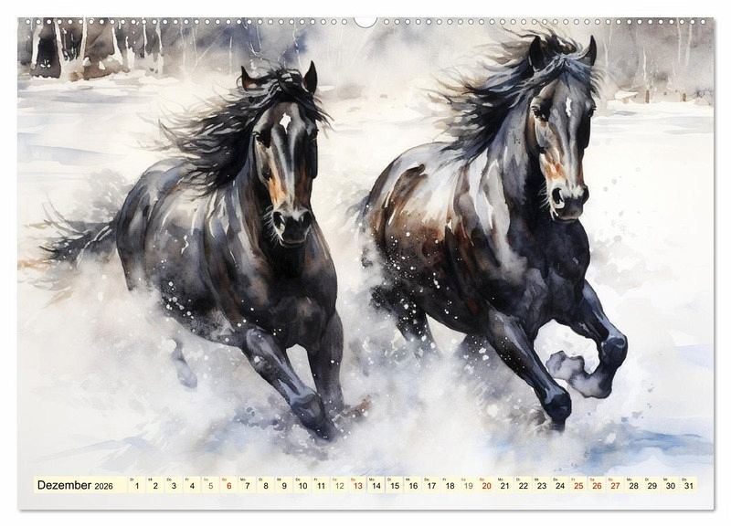 Kraftvoll, romantisch, elegant. Tauchen Sie ein in die Welt der Pferdeschönheiten. Dieser tolle Kalender wurde mit Hilfe von KI erstellt, welche die Anmut und das Feuer schwarzer Pferde in kunstvollen Aquarellen eingefangen hat und die majestätische Präsenz dieser edlen Tiere zeigt. Dies Illustrationen erfreuen jeden Pferdeliebhaber und sind auch ein wunderbares Geschenk.