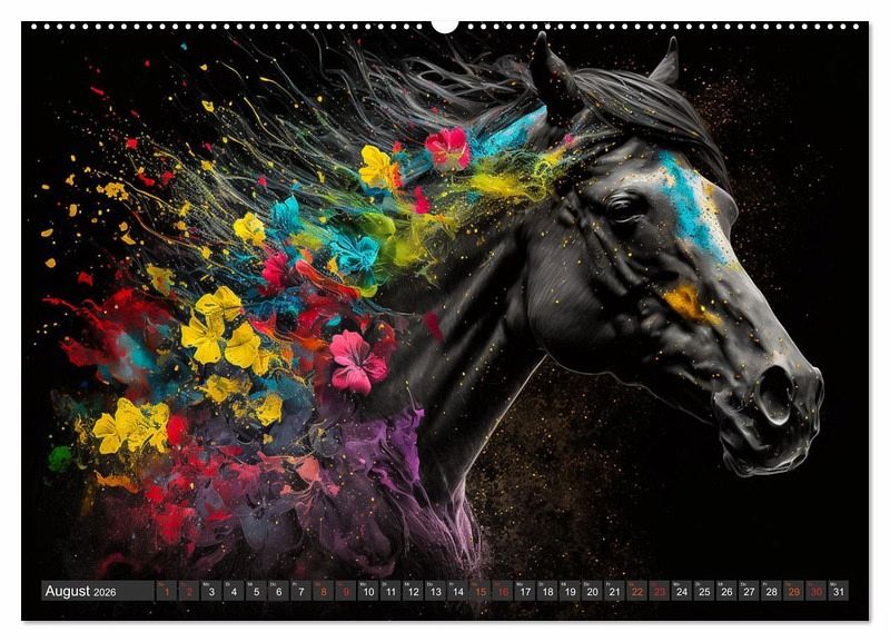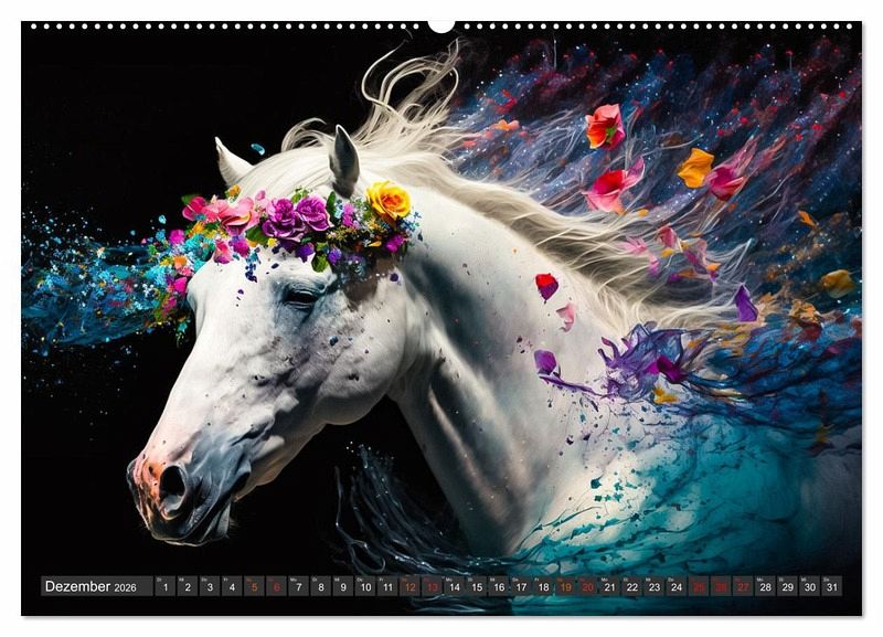 Die Faszination Pferd, wer kennt sie nicht? Und dann noch gepaart mit wunderschönen Blumenvariationen. Die Bilder des Fotografen Dirk Meutzner geben die Schönheit und Eleganz der Tiere wieder, es macht eine Freude Sie Monat für Monat anzuschauen. Die Bilder wurden mit KI und in Photoshop bearbeitet.