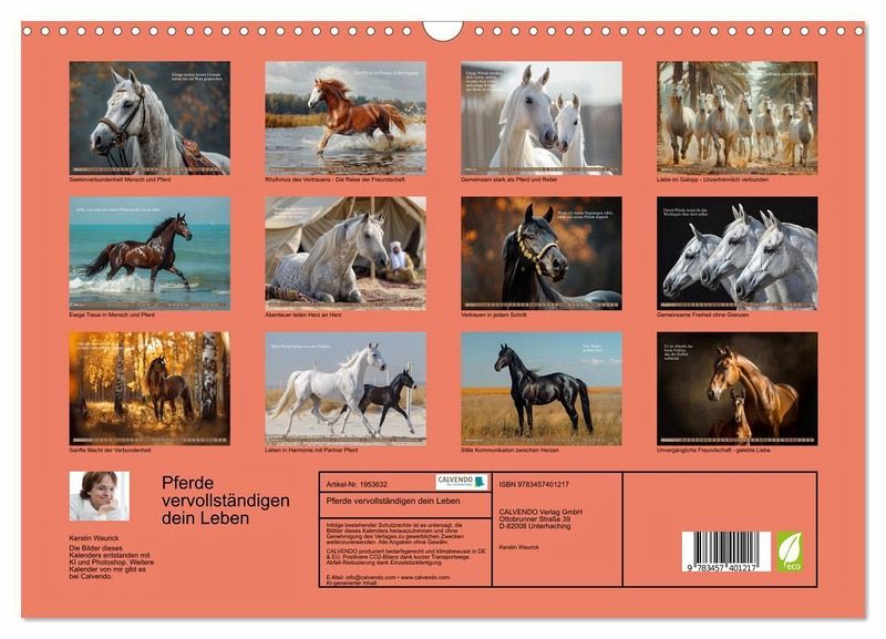 QUALITÄT - Hochwertiger Fotokalender mit 12 wunderschönen Motiven auf lichtbeständigem Bilderdruckpapier, robuste Spiralbindung mit Aufhängebügel.NACHHALTIG - deutliche Abfallreduzierung durch bedarfsgerechte Einzelstückfertigung, umweltfreundliches FSC-zertifiziertes Papier, Produktion in Deutschland, klimabewusste Logistik.PERFEKTES GESCHENK - Kalender für Freunde und Familie, für Kinder und Erwachsene, jung und alt, zu Weihnachten, Geburtstag oder zwischendurch.VIELFALT - Bildkalender in verschiedenen Formaten, z.B. DIN A5, DIN A4, DIN A3 sowie DIN A2. Ob Naturmotiv, Gemälde oder Fotos, ideal für ein persönliches Wohlfühlambiente.Kluge Worte, betörende Bilder für Pferdeliebhaber und Reiter von Autor(in): Kerstin Waurick