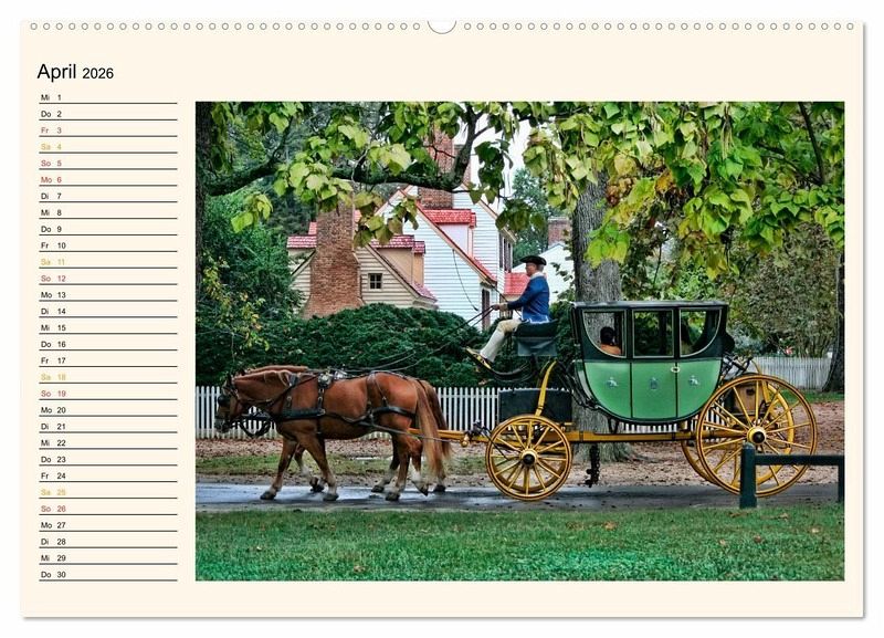 Verfolgt man die Geschichte der Kutschen zurück, so ist festzustellen, dass schon die Römer gefederte Reisewagen benutzten. Später in Manufakturen ganz nach den speziellen Wünschen der Kunden gefertigt endete die Ära dieser schönen Gefährte, als Gottlieb Daimler 1886 in einer Kutsche der Bauart "Americain" einen Motor einbaute und damit das erste vierrädrige Automobil schuf. Für die Freunde dieser imposanten Fahrzeuge hat der Fotokünstler Peter Roder zwölf beeindruckende Aufnahmen von Kutschen zusammengestellt und gestaltet, ein wunderschöner Kalender mit Bildern für das ganze Jahr.