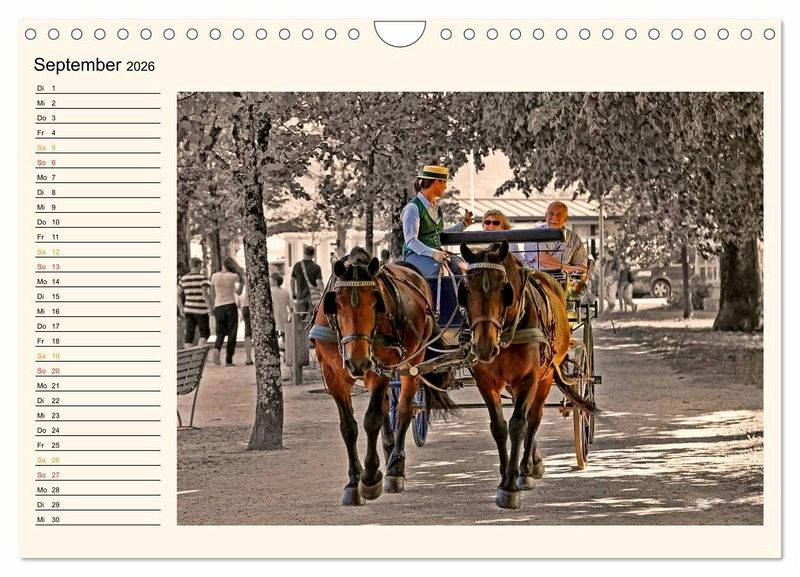 Verfolgt man die Geschichte der Kutschen zurück, so ist festzustellen, dass schon die Römer gefederte Reisewagen benutzten. Später in Manufakturen ganz nach den speziellen Wünschen der Kunden gefertigt endete die Ära dieser schönen Gefährte, als Gottlieb Daimler 1886 in einer Kutsche der Bauart "Americain" einen Motor einbaute und damit das erste vierrädrige Automobil schuf. Für die Freunde dieser imposanten Fahrzeuge hat der Fotokünstler Peter Roder zwölf beeindruckende Aufnahmen von Kutschen zusammengestellt und gestaltet, ein wunderschöner Kalender mit Bildern für das ganze Jahr.