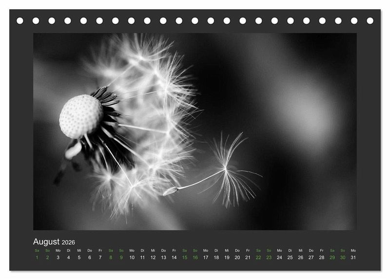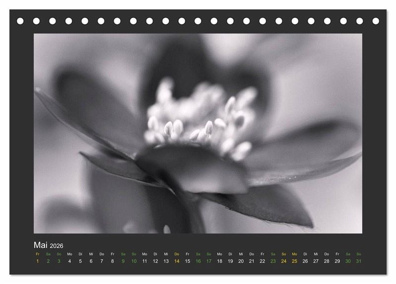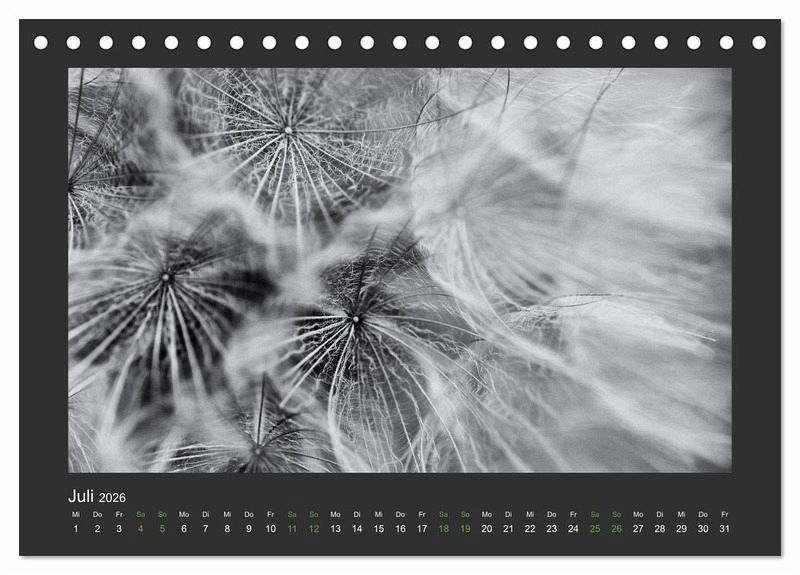 Wald- und Wiesenpflanzen außergewöhnlich in Szene gesetzt. Durch die Schwarz-Weiß-Umsetzung reduziert auf Form und Struktur, begleiten Sie 13 Fine-Art-Makroaufnahmen ein ganzes Jahr lang. Genießen Sie die Pflanzenwelt, die Schönheit der Natur auf eine stilvolle und reduzierte Weise.