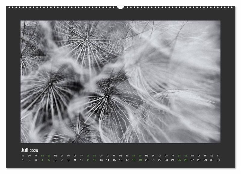 Wald- und Wiesenpflanzen außergewöhnlich in Szene gesetzt. Durch die Schwarz-Weiß-Umsetzung reduziert auf Form und Struktur, begleiten Sie 13 Fine-Art-Makroaufnahmen ein ganzes Jahr lang. Genießen Sie die Pflanzenwelt, die Schönheit der Natur auf eine stilvolle und reduzierte Weise.