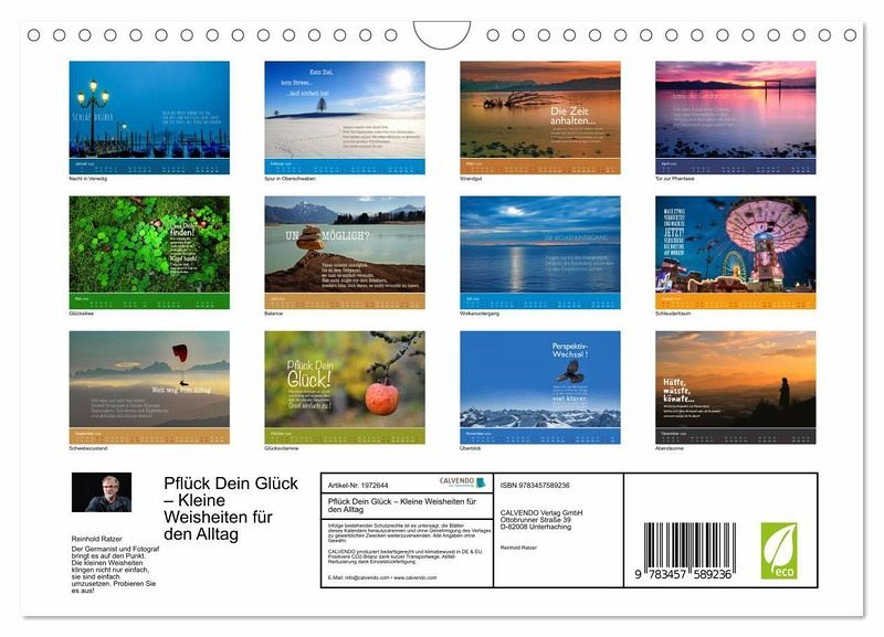 QUALITÄT - Hochwertiger Fotokalender mit 12 wunderschönen Motiven auf lichtbeständigem Bilderdruckpapier, robuste Spiralbindung mit Aufhängebügel.NACHHALTIG - deutliche Abfallreduzierung durch bedarfsgerechte Einzelstückfertigung, umweltfreundliches FSC-zertifiziertes Papier, Produktion in Deutschland, klimabewusste Logistik.PERFEKTES GESCHENK - Kalender für Freunde und Familie, für Kinder und Erwachsene, jung und alt, zu Weihnachten, Geburtstag oder zwischendurch.VIELFALT - Bildkalender in verschiedenen Formaten, z.B. DIN A5, DIN A4, DIN A3 sowie DIN A2. Ob Naturmotiv, Gemälde oder Fotos, ideal für ein persönliches Wohlfühlambiente.Kleine Weisheiten als Lebenshilfe für den Alltag von Autor(in): Reinhold Ratzer