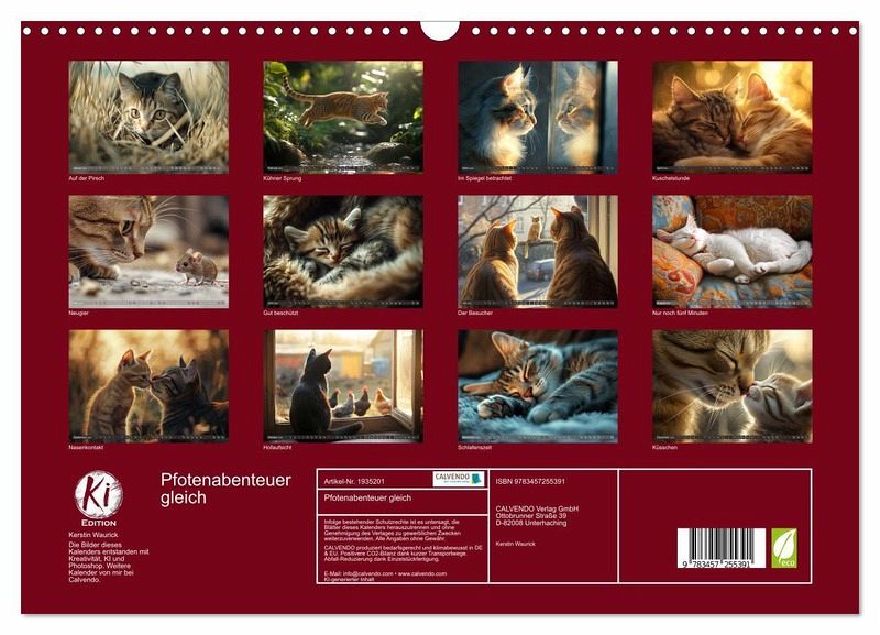 Entdecken Sie die zauberhafte Welt der Katzen in unserem einzigartigen Kalender! 12 atemberaubende KI-generierte Nahaufnahmen zeigen Samtpfoten in all ihren Facetten - von kuscheligen Schlafmomenten bis zu abenteuerlichen Szenen voller Eleganz. Jede Seite ist ein Meisterwerk, fotorealistisch und voller Details, die das Herz höherschlagen lassen. Lassen Sie sich von der Magie moderner KI-Kunst verzaubern und holen Sie sich ein Stück Katzenliebe für Ihr Zuhause. Perfekt als Geschenk oder für echte Katzenfans!