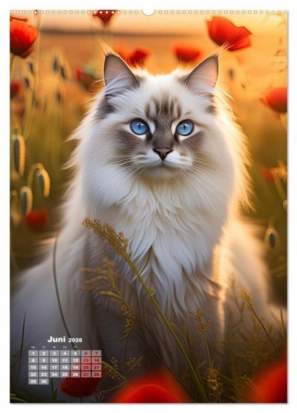 Juni: Ragdoll sitzt in einem Feld zwischen roten Mohnblumen