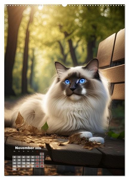 November: Ragdoll liegt auf einer mit Herbstlaub bedeckten Parkbank