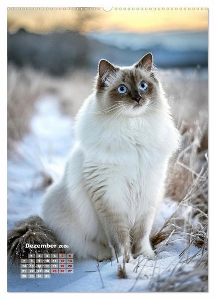 Dezember: Ragdoll sitzt im Schnee neben gefrorenen Gräsern