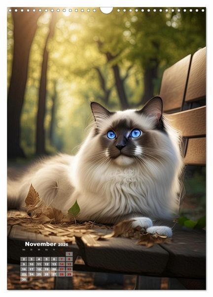 November: Ragdoll liegt auf einer mit Herbstlaub bedeckten Parkbank