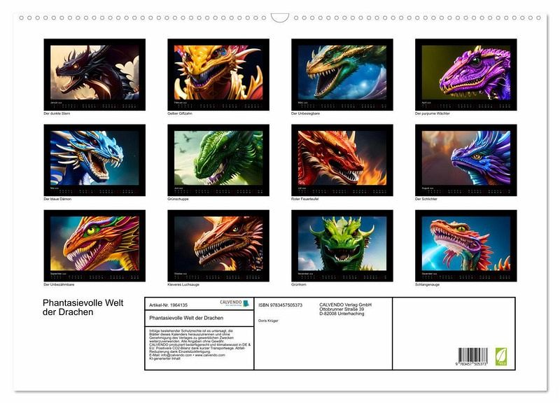 Liebevoll gestaltete Drachenportraits fangen die Essenz dieser mystischen Wesen ein und lassen uns in eine Welt voller Abenteuer, Magie und unendlicher Möglichkeiten eintauchen. Dieser Kalender ist ein Blickfang an der Wand. Ob als Geschenk für Fantasy-Liebhaber, Drachenenthusiasten oder Highlight in den eigenen vier Wänden - der phantasievolle, farbenfrohe Drachenkalender ist ein wahrer Schatz für alle, die sich von der Kraft und Schönheit dieser mystischen Wesen verzaubern lassen möchten. Die Bilder sind mit Hilfe von KI entstanden.