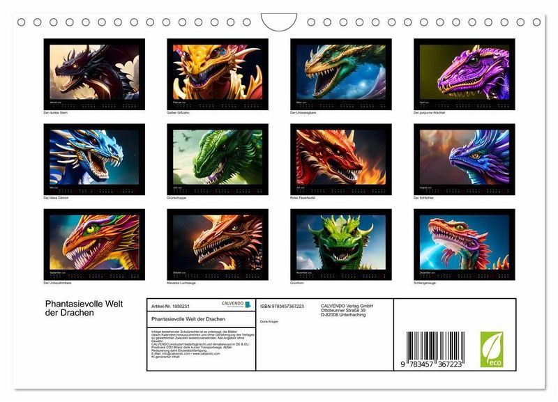 QUALITÄT - Hochwertiger Fotokalender mit 12 wunderschönen Motiven auf lichtbeständigem Bilderdruckpapier, robuste Spiralbindung mit Aufhängebügel.NACHHALTIG - deutliche Abfallreduzierung durch bedarfsgerechte Einzelstückfertigung, umweltfreundliches FSC-zertifiziertes Papier, Produktion in Deutschland, klimabewusste Logistik.PERFEKTES GESCHENK - Kalender für Freunde und Familie, für Kinder und Erwachsene, jung und alt, zu Weihnachten, Geburtstag oder zwischendurch.VIELFALT - Bildkalender in verschiedenen Formaten, z.B. DIN A5, DIN A4, DIN A3 sowie DIN A2. Ob Naturmotiv, Gemälde oder Fotos, ideal für ein persönliches Wohlfühlambiente.Eine faszinierende Welt der Drachen, die in lebendigen Farben und detailreichen Portraits zum Leben erweckt wird. von Autor(in): Doris Krüger