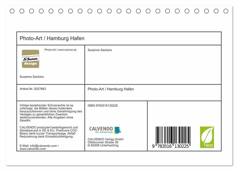 Der Hamburger Hafen, ein wunderbarer Ort voller Inspiration. Zwölf hochwertige Fotokunstwerke zeigen persönliche Impressionen der Hamburger Künstlerin und Designerin Susanne Sachers (www.ssense.de, www.sachers.de) und ihre Liebe zum "Tor der Welt". Unter Verwendung eigener Fotografien, und aufwändig gestaltet, ist dieser Kalender ein Must-Have nicht nur für jeden Kunst- und Hamburg-Liebhaber!