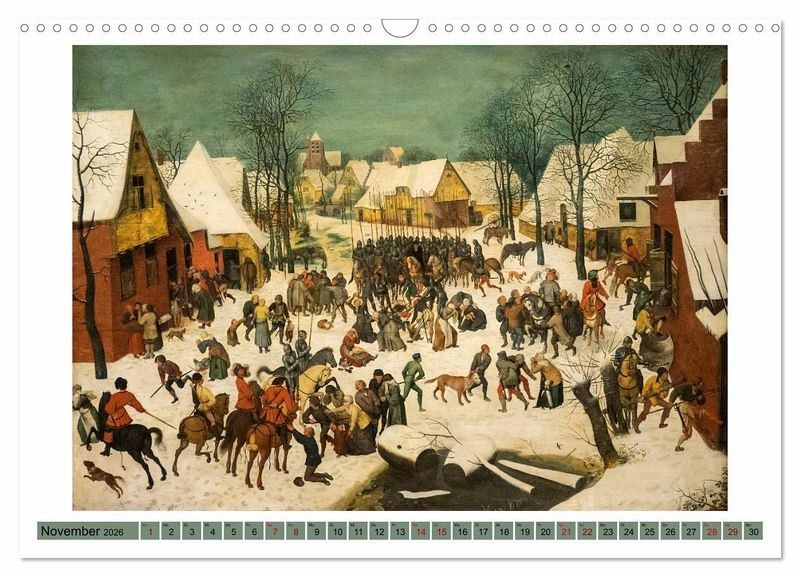 Bruegel führte die flämische Landschaftsmalerei des 16. Jahrhunderts auf ihren Höhepunkt, begründete das niederländische Bauerngenre und schuf zahlreiche allegorische Werke, die sich auf Sprichwörter, Volkskultur und humanistische Kultur beziehen. Dieser Bildkalender zeigt zwölf seiner Meisterwerke aus den Beständen des Kunsthistorischen Museums Wien.