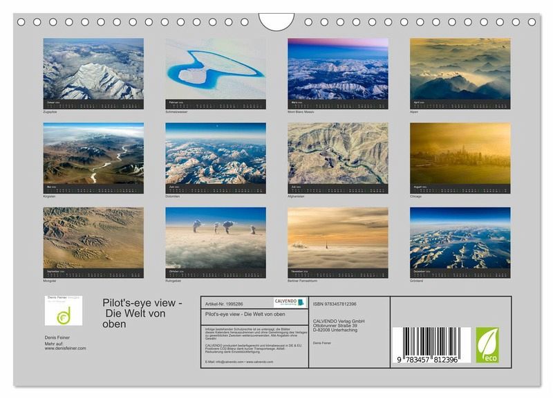 QUALITÄT - Hochwertiger Fotokalender mit 12 wunderschönen Motiven auf lichtbeständigem Bilderdruckpapier, robuste Spiralbindung mit Aufhängebügel.NACHHALTIG - deutliche Abfallreduzierung durch bedarfsgerechte Einzelstückfertigung, umweltfreundliches FSC-zertifiziertes Papier, Produktion in Deutschland, klimabewusste Logistik.PERFEKTES GESCHENK - Kalender für Freunde und Familie, für Kinder und Erwachsene, jung und alt, zu Weihnachten, Geburtstag oder zwischendurch.VIELFALT - Bildkalender in verschiedenen Formaten, z.B. DIN A5, DIN A4, DIN A3 sowie DIN A2. Ob Naturmotiv, Gemälde oder Fotos, ideal für ein persönliches Wohlfühlambiente.Luftbilder aus allen Teilen der Erde von Autor(in): Denis Feiner