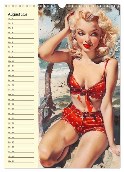 Dieser Pin-up-Kalender bringt die charmante und verspielte Ästhetik der 50er Jahre direkt an den Strand. Jedes Bild wurde mit Hilfe von KI erstellt und zeigt eine wunderschöne Frau in stilvoller Bademode, die sowohl humorvoll als auch sexy posiert. Lassen Sie sich von der zeitlosen Schönheit und dem nostalgischen Flair verzaubern, während Sie Monat für Monat die kunstvollen Strandmomente genießen. Ein perfektes Geschenk für Liebhaber klassischer Pin-up-Kunst und Sommerträume.