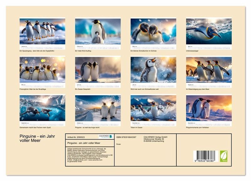Sie watscheln, tauchen, brüten und schauen gemeinsam in die Ferne und dabei erobern sie unsere Herzen, Pinguine - die charmanten Überlebenskünstler inmitten ihres natürlichen Lebensraums. Ob im Gleichschritt wie Orgelpfeifen, als fürsorgliche Väter bei der Brutpflege oder beim Gang ins eisige Wasser - jedes dieser wunderschönen ki-generierten Bilder fängt einen besonderen Moment ein und erzählen Geschichten von Gemeinschaft, Stärke, Neugier und stiller Komik. Ein Kalender, der die Pinguine nicht erklärt, sondern sie einfach sein lässt und dabei ein Lächeln ins Gesicht zaubert. Ein Jahr zum…mehr