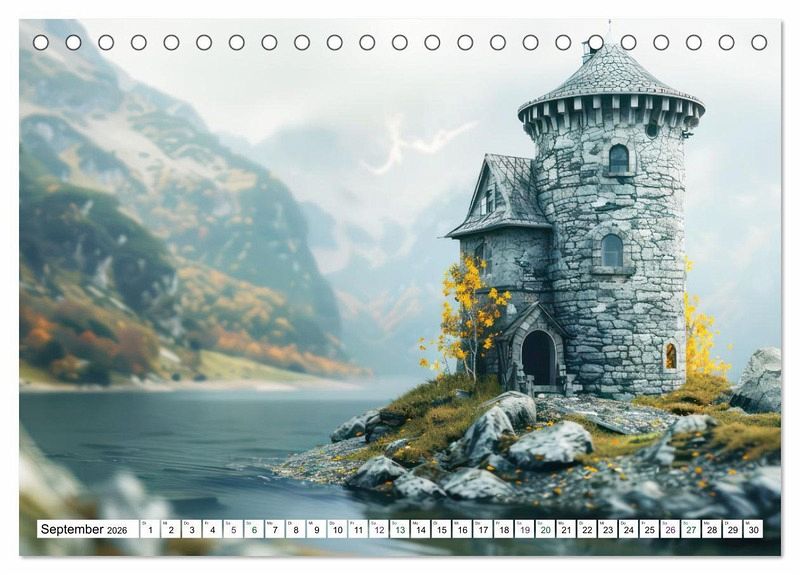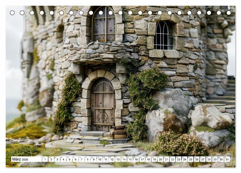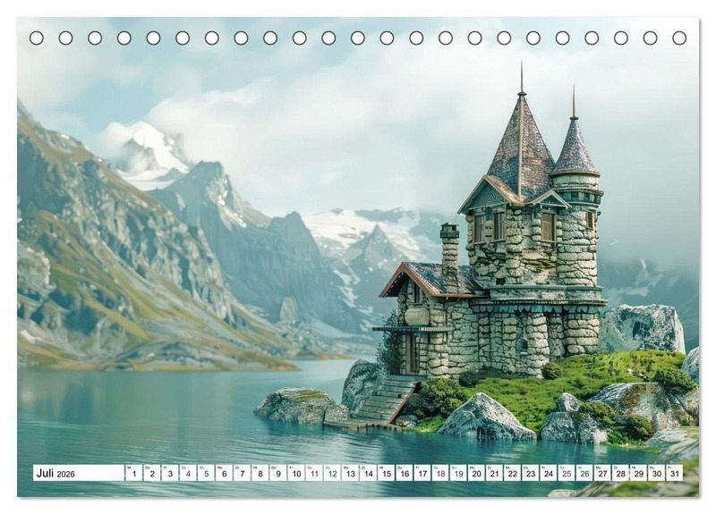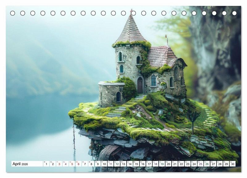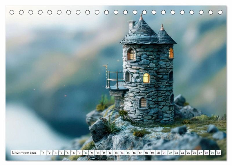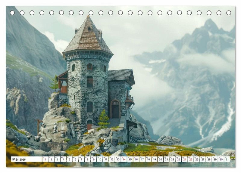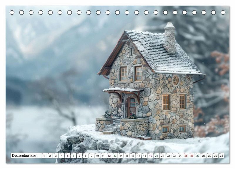 Die tilt-shift Darstellung verleiht den Steinhäusern einen zauberhaften Charme und lässt sie dank diesem Miniatureffekt noch malerischer wirken. Jeden Monat können Sie sich an den Steinhäusern in prächtigen Landschaften erfreuen. Sie stehen auf einem Berggipfel, am Ufer eines Sees oder umgeben von Moos und Steinen.