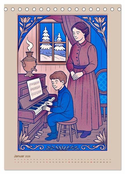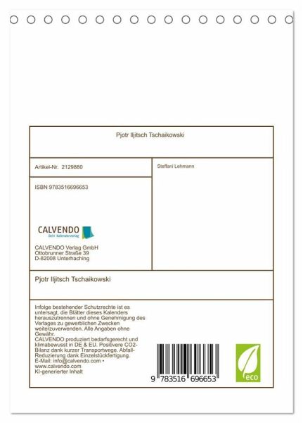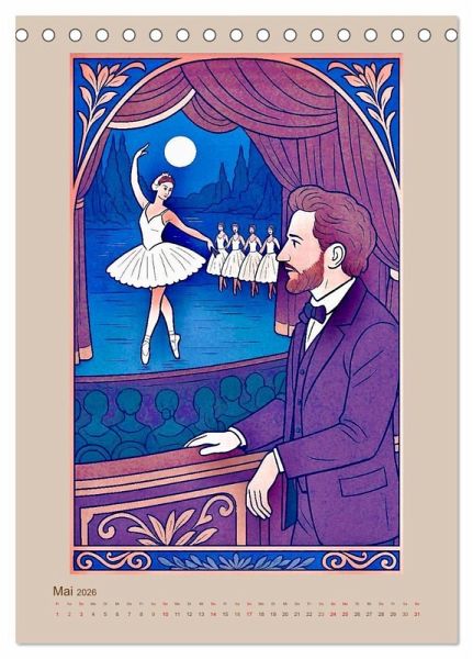 Tauchen Sie ein in die zauberhafte Welt von Pjotr Iljitsch Tschaikowski, dem Komponisten unvergänglicher Ballette, leidenschaftlicher Opern und tief berührender Sinfonien. Dieser Kalender zeigt bedeutende Stationen seines Lebens und seine berühmten Werke wie "Schwanensee". Die Bilder, die Steffani Lehmann mit Unterstützung einer KI editiert hat, sind inspiriert von russischer Holzschnittkunst und der Ästhetik des Fin de Siècle. Ein bezaubernder Kalender voller Musik, Gefühl und Geschichte für Liebhaber klassischer Kunst und russischer Kultur.