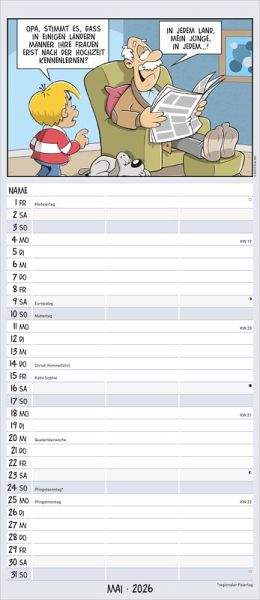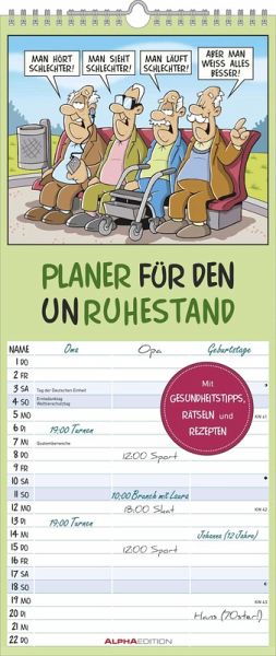 Dank der unterhaltsamen Cartoons ist der Rentnerkalender ein wunderbarer, humorvoller Begleiter durch das ganze Jahr. Die farbenfrohen Karikaturen zu Themen aus dem Rentner-Alltag, allesamt gestaltet von Dirk Pietrzak, machen diesen Streifenkalender im Format von 14,85x42 cm zu einem echten Hingucker.