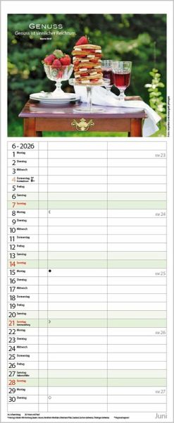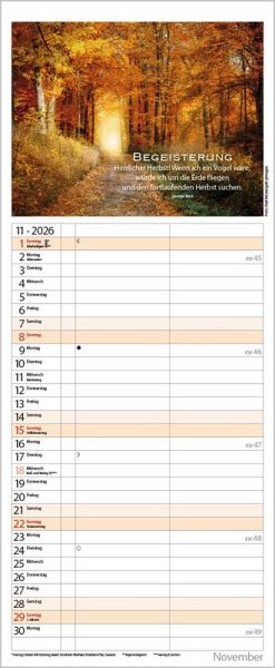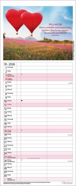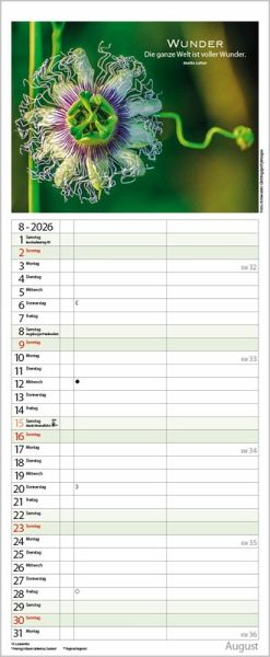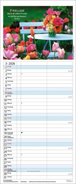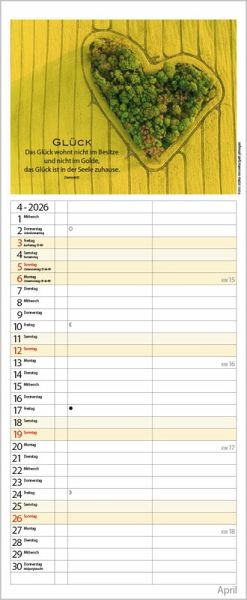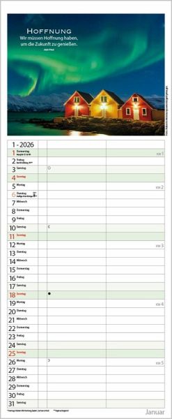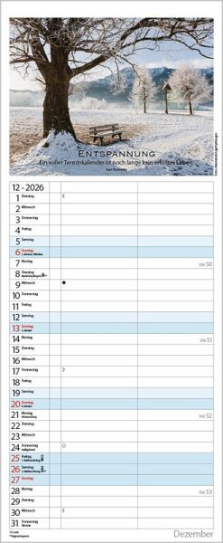Übersichtlicher Familienplaner für bis zu 3 Personen; sehr stabile Rückwand; 19 x 46 cm Jeden Monat ein lustiger Cartoon über den Spalten. Ohne störende Bilder in den Spalten Dickes, umweltfreundliches FSC Papier; leichte Beschreibbarkeit, auch mit Bunt- und Bleistiften Deutsches Kalendarium mit regionalen Feiertagen für Deutschland, Österreich und Schweiz Farblich hervorgehobene Sonn- und Feiertage, sowie Anzeige der Zeitumstellung