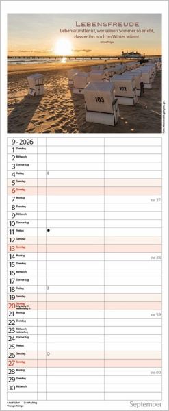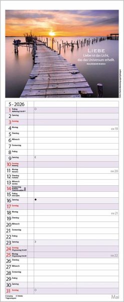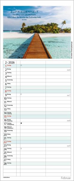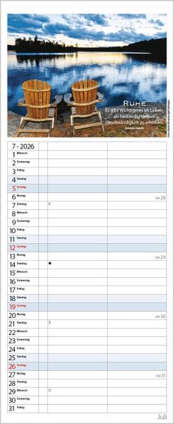 Der Planer für alle, die endlich Zeit haben für Hobbys, Freunde, Familie, Reisen und Co. Mit wunderschönen Fotos und klugen Zitaten. Neben dem gesamten Kalenderjahr enthält der Wandplaner auch eine Vorschau bis März des Folgejahres.
