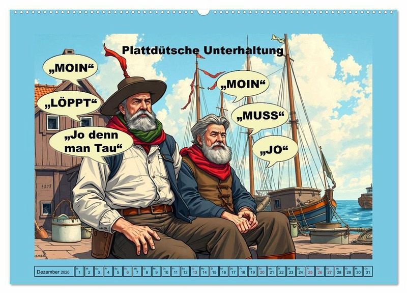 Plattdeutsch ist eine regionale Sprache, die vor allem in Norddeutschland und angrenzenden Gebieten der Niederlande gesprochen wird. Kulturell hat Plattdeutsch große Bedeutung, da sie ein wichtiger Teil der Identität vieler Menschen in Norddeutschland ist. Die Sprache spiegelt die Geschichte, Traditionen und das Alltagsleben der Region wider. In den letzten Jahren hat das Interesse an Plattdeutsch zugenommen, und es gibt zahlreiche Initiativen, um die Sprache zu fördern und zu bewahren, insbesondere in Schulen und bei kulturellen Veranstaltungen. Plattdeutsch ist somit nicht nur eine Sprache, sondern auch ein lebendiger Teil des kulturellen Erbes, der die Menschen in der Region verbindet. In diesem Kalender habe ich plattdeutschen Wortschatz mit KI-generierten Cartoons unterlegt.