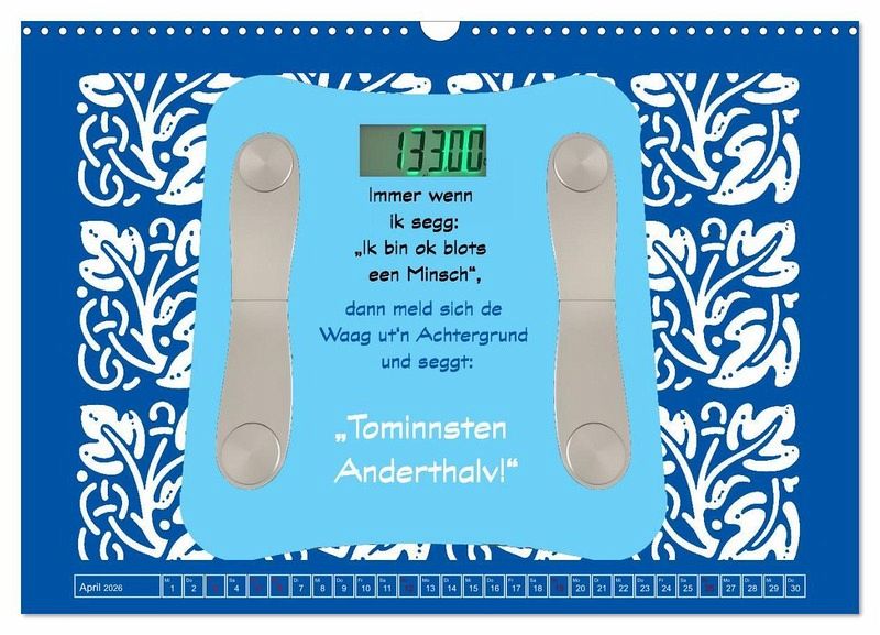 QUALITÄT - Hochwertiger Fotokalender mit 12 wunderschönen Motiven auf lichtbeständigem Bilderdruckpapier, robuste Spiralbindung mit Aufhängebügel.NACHHALTIG - deutliche Abfallreduzierung durch bedarfsgerechte Einzelstückfertigung, umweltfreundliches FSC-zertifiziertes Papier, Produktion in Deutschland, klimabewusste Logistik.PERFEKTES GESCHENK - Kalender für Freunde und Familie, für Kinder und Erwachsene, jung und alt, zu Weihnachten, Geburtstag oder zwischendurch.VIELFALT - Bildkalender in verschiedenen Formaten, z.B. DIN A5, DIN A4, DIN A3 sowie DIN A2. Ob Naturmotiv, Gemälde oder Fotos, ideal für ein persönliches Wohlfühlambiente.Für Liebhaber der norddeutschen Mundart von Autor(in): Claudia Kleemann