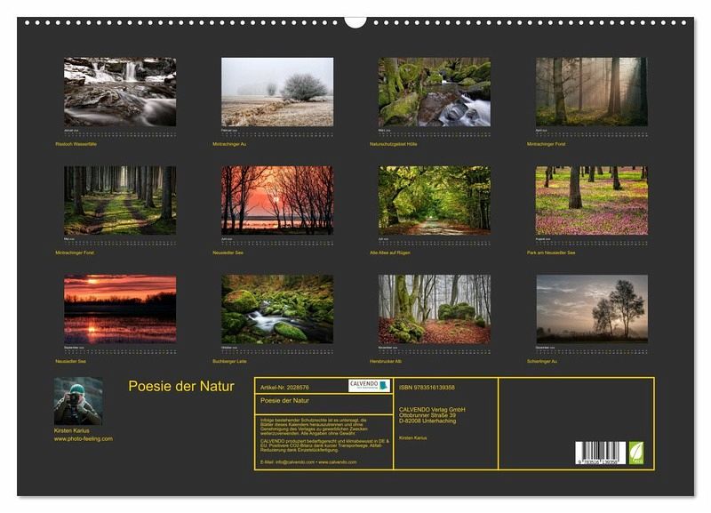QUALITÄT - Hochwertiger Fotokalender mit 12 wunderschönen Motiven auf lichtbeständigem Bilderdruckpapier, robuste Spiralbindung mit Aufhängebügel.NACHHALTIG - deutliche Abfallreduzierung durch bedarfsgerechte Einzelstückfertigung, umweltfreundliches FSC-zertifiziertes Papier, Produktion in Deutschland, klimabewusste Logistik.PERFEKTES GESCHENK - Kalender für Freunde und Familie, für Kinder und Erwachsene, jung und alt, zu Weihnachten, Geburtstag oder zwischendurch.VIELFALT - Bildkalender in verschiedenen Formaten, z.B. DIN A5, DIN A4, DIN A3 sowie DIN A2. Ob Naturmotiv, Gemälde oder Fotos, ideal für ein persönliches Wohlfühlambiente.In stimmungsvollen Fotografien hat Kirsten Karius Schönheit, Stille und Farben der Natur festgehalten. von Autor(in): Kirsten Karius