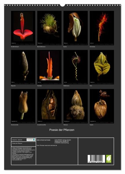 In den Schönheiten der Pflanzen, offenbart sich die Schönheit der Natur. Hier sind 12 Motive, wie sie nur sehr selten in der Natur vorkommen. Ein geschultes Auge hat sie entdeckt, ein sensibles Wesen, mit Hilfe hervorragender Technik für die Ewigkeit gebannt. 12 Monate, 12 Motive, die den Blick bannen, neugierig machen, die Fantasie und die Gefühle wecken.