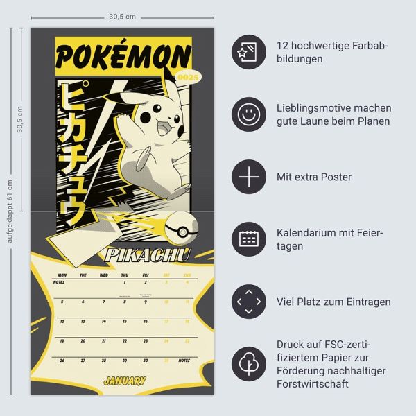 - Next pokestop? Bei dir zuhause! Der große Wandplaner 2026 für alle Fans von Pikachu, Enton und Co.- Action für ein ganzes Jahr: Wandkalender mit viel Platz für Termine, coolen Pokémon-Bildern und extra Poster zum Herausnehmen- Organisations-Hilfe und Blickfang zugleich: Pokémon-Kalender im Format 30,5 x 30,5 cm (geöffnet 30,5 x 61 cm)- Gotta catch 'em all: Tolles Geschenk für alle Fans der Anime-Serie, der Spiele und von Pokémon Go- Mit deinen Lieblingshelden durch das Jahr: die Original-Danilo-Kalender aus dem Athesia Kalenderverlag