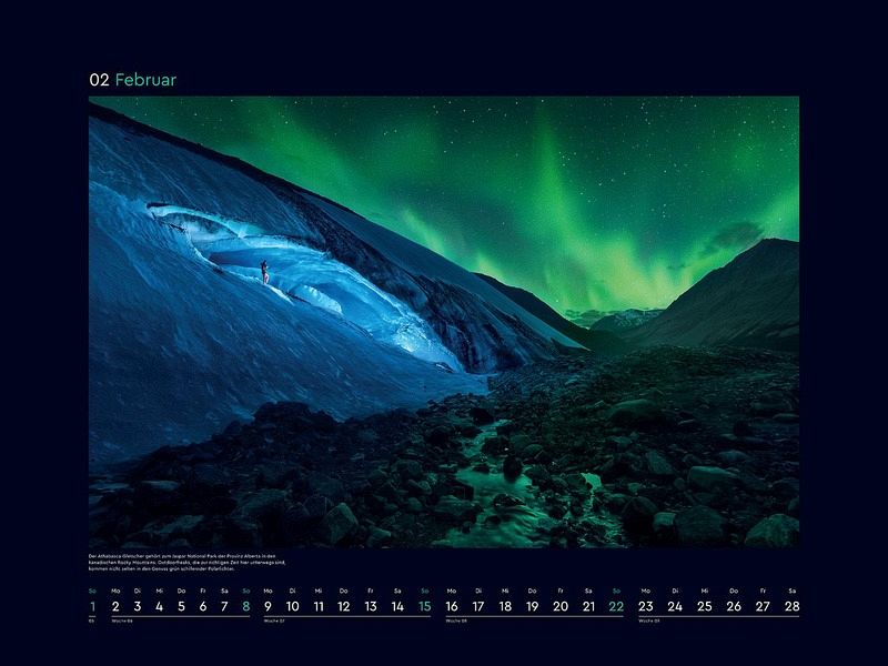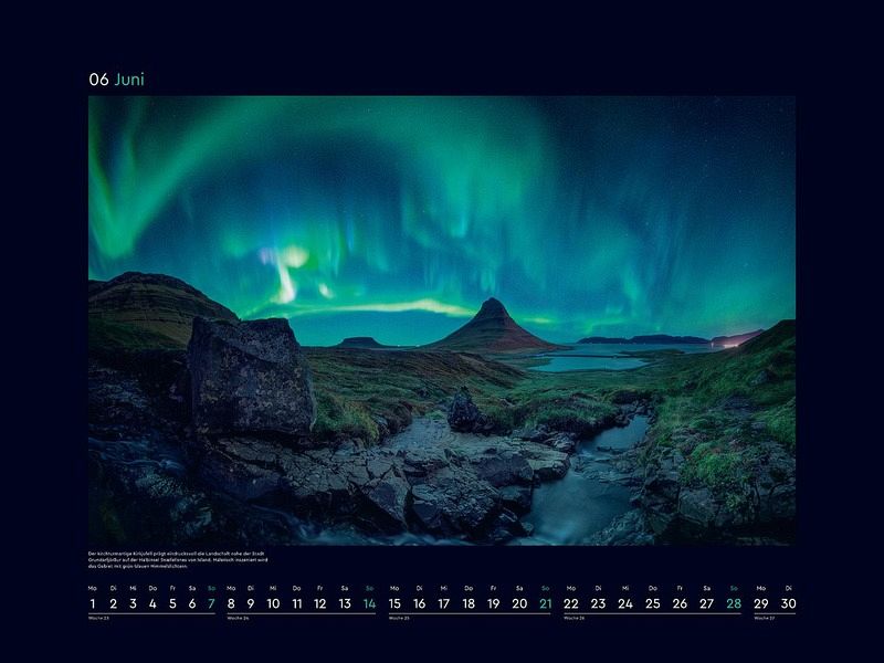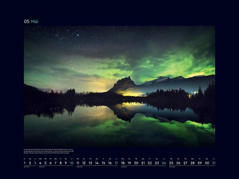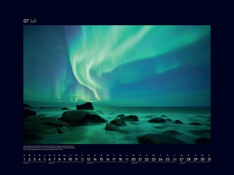 In alten Beschreibungen wird das Polarlicht als eine überirdische Erscheinung, als Zeichen der Götter aufgefasst. Die Wissenschaft hat diese Erklärungsversuche zwar entzaubert, konnte aber nichts von der Magie nehmen. Der Kalender zeigt zwölf mystisch leuchtende Nachthimmel.