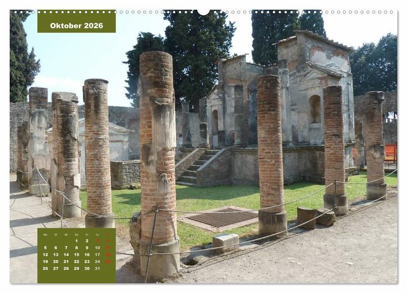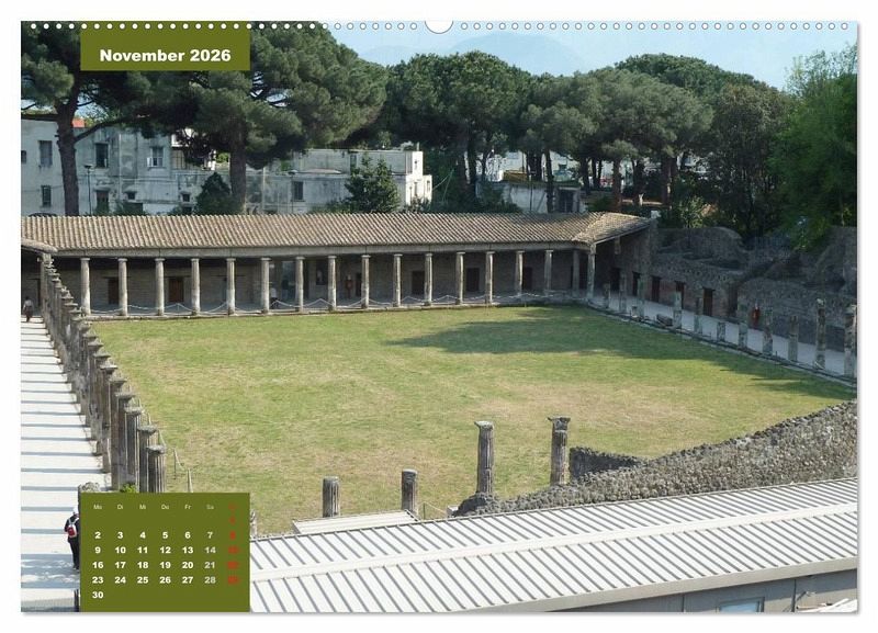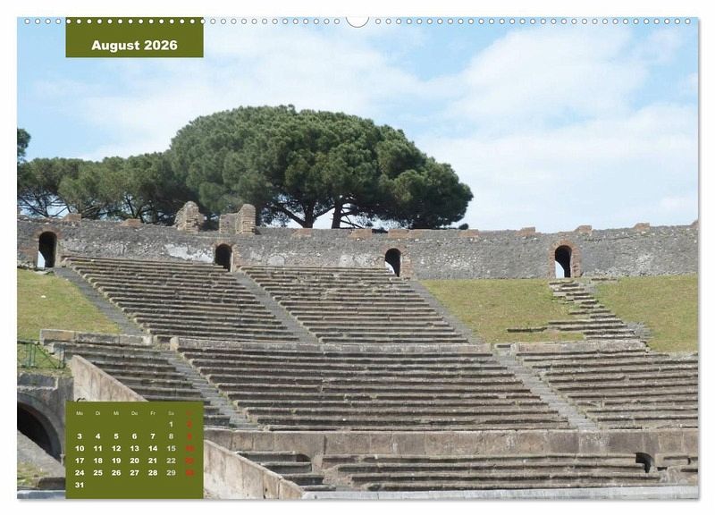 Die antike Stadt Pompeji wurde im Jahr 73 n. Chr. vom Ausbruch des Vesuvs verschüttet und erst im 18. Jahrhundert wieder freigelegt. Durch diese Konservierung der antiken Stadt ist das nahe bei Neapel gelegene Pompeji zu einer der berühmtesten Ausgrabungsstätten der antiken Welt geworden. Der Besucher, der sich heute durch die Straßen der Stadt bewegt, findet sich auf magische Art und Weise in die Antike zurückversetzt, da Therme, Freilichtbühnen und Amphitheater so gut erhalten bzw. restauriert worden sind. Bis ins Mark erschütternd sind zudem die Gipsabdrücke von Menschen, die von dem Kataklysmus des Vesuvs überrascht wurden und keine Chance hatten, sich in Sicherheit zu bringen. Dieser Kalender macht in beeindruckenden Bildern diese einmalige Ausgrabungsstätte der Antike lebendig.