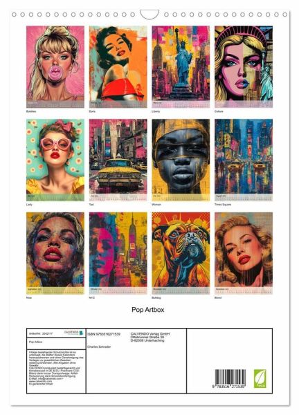 Bringen Sie Farbe und Energie in Ihr Jahr mit unserem exklusiven Pop Art Kalender! Tauchen Sie ein in die pulsierende Welt der Pop Art und lassen Sie sich jeden Monat von kraftvollen Farben, ikonischen Motiven und kreativen Statements inspirieren. Dieser Kalender ist ein wahres Kunstwerk, das die Dynamik und den rebellischen Geist der Pop Art-Bewegung feiert - perfekt für alle, die Kunst lieben, die aus dem Rahmen fällt.