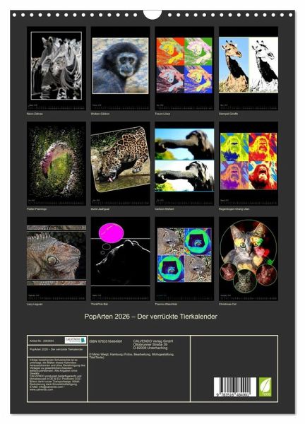 QUALITÄT - Hochwertiger Fotokalender mit 12 wunderschönen Motiven auf lichtbeständigem Bilderdruckpapier, robuste Spiralbindung mit Aufhängebügel.NACHHALTIG - deutliche Abfallreduzierung durch bedarfsgerechte Einzelstückfertigung, umweltfreundliches FSC-zertifiziertes Papier, Produktion in Deutschland, klimabewusste Logistik.PERFEKTES GESCHENK - Kalender für Freunde und Familie, für Kinder und Erwachsene, jung und alt, zu Weihnachten, Geburtstag oder zwischendurch.VIELFALT - Bildkalender in verschiedenen Formaten, z.B. DIN A5, DIN A4, DIN A3 sowie DIN A2. Ob Naturmotiv, Gemälde oder Fotos, ideal für ein persönliches Wohlfühlambiente.Kalender mit tollen Tieren im Pop-Art Stil. von Autor(in): Mirko Weigt