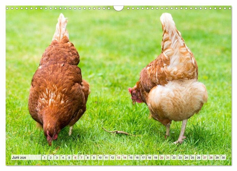 Juni: Haushühner (Gallus gallus domesticus) picken auf einer Wiese