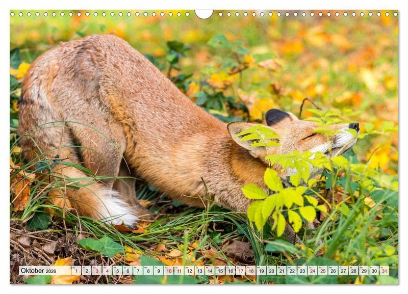 Oktober: Rotfuchs (Vulpes vulpes) reckt sich nach dem Schlafen