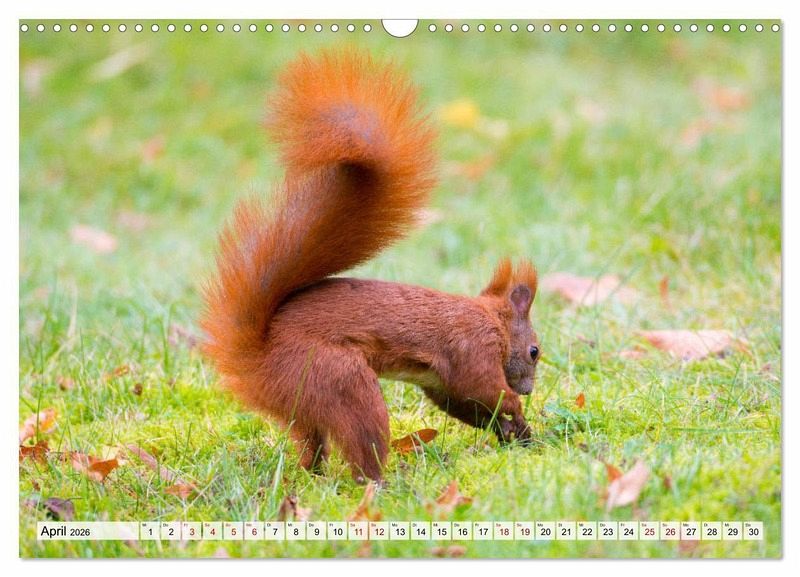 April: Europäisches Eichhörnchen (Sciurus vulgaris) gräbt in einer Wiese