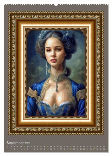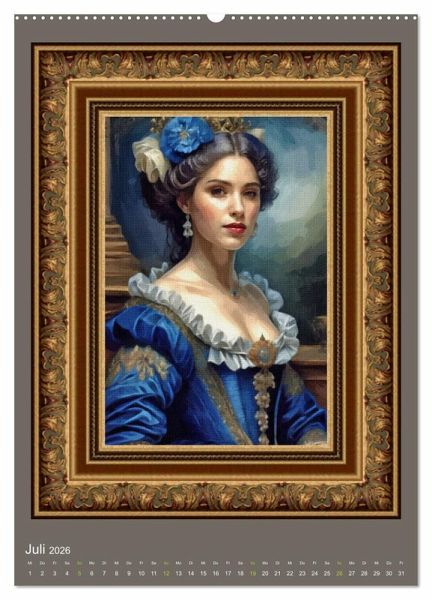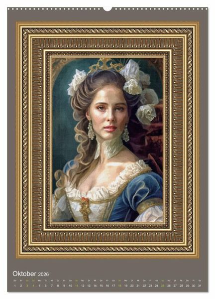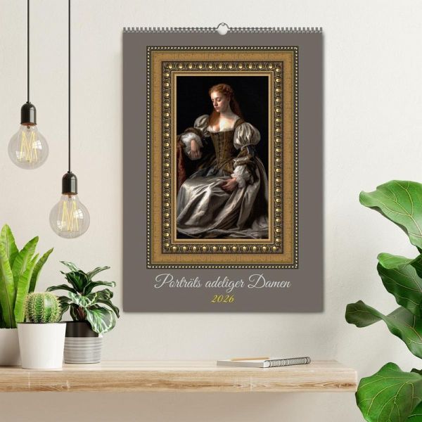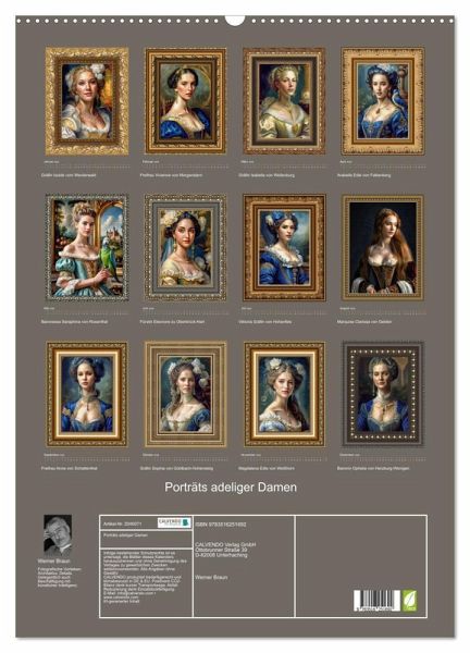 Gelegentlich findet man sie in herrschaftlichen Schlössern, die Porträts der Herrschaften, die früher an diesem Ort gewohnt haben und die die Geschichte der Familie und des Herrschaftsgebiets mitgeprägt haben. Mit Hilfe der künstlichen Intelligenz haben wir exemplarisch solche Porträts von edlen Damen in diesem Kalender versammelt. Trotz einer gewissen Strenge in der Darstellung zeigen sich dabei doch auch sehr unterschiedliche Charaktere. Lassen Sie die Damen auch in Ihrem Zuhause repräsentativ auftreten. Die Namen und die Titel sind frei erfunden.