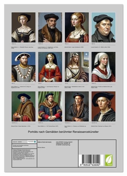 In der Geschichte der Malerei der deutschen Renaissance finden wir drei herausragende Namen: Albrecht Dürer, Lucas Cranach der Ältere und Hans Holbein der Jüngere. Jeder hat auf seine eigene Weise auch dazu beigetragen, den Menschen als Individuum darzustellen. In diesem Kalender finden wir einige ihrer Porträts, die mit KI-Unterstützung realistisch in in der Weise dargestellt sind, wie das jeweilige Modell des betroffenen Malers ausgesehen haben könnte. Unter den Modellen finden wir einfache Menschen, aber auch historisch bedeutende Persönlichkeiten, welche die Geschichte des Abendlandes entscheidend beeinflusst haben.
