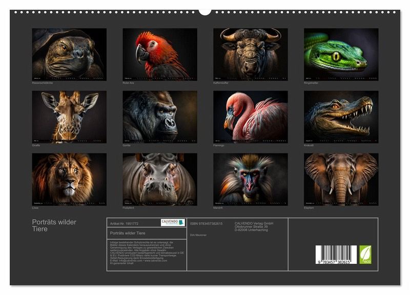 Schildkröte, Büffel, Löwe, Papagei, wer kennt Sie nicht diese einmaligen wundervollen schönen Tiere. In diesem Kalender hat der Fotokünstler Dirk Meutzner sich mit einer KI und Photoshop an die Arbeit gemacht, diese Tiere ganz nah heranzuholen. Herausgekommen sind diese zwölf farbenprächtigen Bilder, die Sie Monat für Monat begeistern werden.