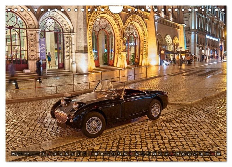 August: Englischer Oldtimer vor dem Bahnhof Rossio in Lissabon