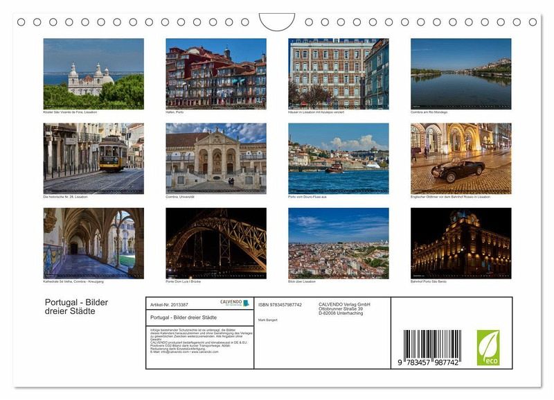 QUALITÄT - Hochwertiger Fotokalender mit 12 wunderschönen Motiven auf lichtbeständigem Bilderdruckpapier, robuste Spiralbindung mit Aufhängebügel.NACHHALTIG - deutliche Abfallreduzierung durch bedarfsgerechte Einzelstückfertigung, umweltfreundliches FSC-zertifiziertes Papier, Produktion in Deutschland, klimabewusste Logistik.PERFEKTES GESCHENK - Kalender für Freunde und Familie, für Kinder und Erwachsene, jung und alt, zu Weihnachten, Geburtstag oder zwischendurch.VIELFALT - Bildkalender in verschiedenen Formaten, z.B. DIN A5, DIN A4, DIN A3 sowie DIN A2. Ob Naturmotiv, Gemälde oder Fotos, ideal für ein persönliches Wohlfühlambiente.Bilder von Lissabon, Porto und Coimbra von Autor(in): Mark Bangert