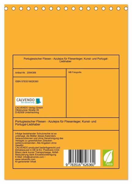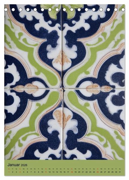 Fliesenleger aufgepasst - und alle, die Fliesen lieben! Dieser außergewöhnliche Kunstkalender zeigt Monat für Monat kunstvolle Azulejos aus Portugal: farbenfrohe portugiesische Fliesen und portugiesische Kacheln, inspiriert von echter Tradition und Handwerk. Ob filigrane Kacheln, edle Wandfliesen oder starke Muster - jede Fliese wurde mit moderner KI neu interpretiert und perfekt in Szene gesetzt. Ein echtes Highlight für Designfans, Ästheten und Kreative. Der ideale Fliesen-Kalender - als stilvolles Wohnaccessoire in der Küche, oder im Wohnzimmer und Hausgang, oder besonderes Geschenk für Fliesenleger. Mehr als nur ein Fliesenkalender: ein Jahr voller Farbe, Form, Design und Inspiration.