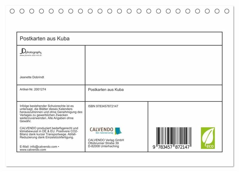 QUALITÄT - Hochwertiger Fotokalender mit 12 wunderschönen Motiven auf lichtbeständigem Bilderdruckpapier, robuste Spiralbindung.NACHHALTIG - deutliche Abfallreduzierung durch bedarfsgerechte Einzelstückfertigung, umweltfreundliches FSC-zertifiziertes Papier, Produktion in Deutschland, klimabewusste Logistik.PERFEKTES GESCHENK - Kalender für Freunde und Familie, für Kinder und Erwachsene, jung und alt, zu Weihnachten, Geburtstag oder zwischendurch.VIELFALT - Bildkalender in verschiedenen Formaten, z.B. DIN A5, DIN A4, DIN A3 sowie DIN A2. Ob Naturmotiv, Gemälde oder Fotos, ideal für ein persönliches Wohlfühlambiente.Erleben Sie die Faszination von Kuba mit diesen Postkarten-Motiven von Autor(in): Jeanette Dobrindt