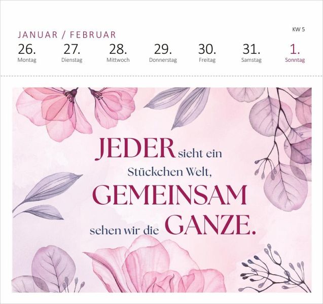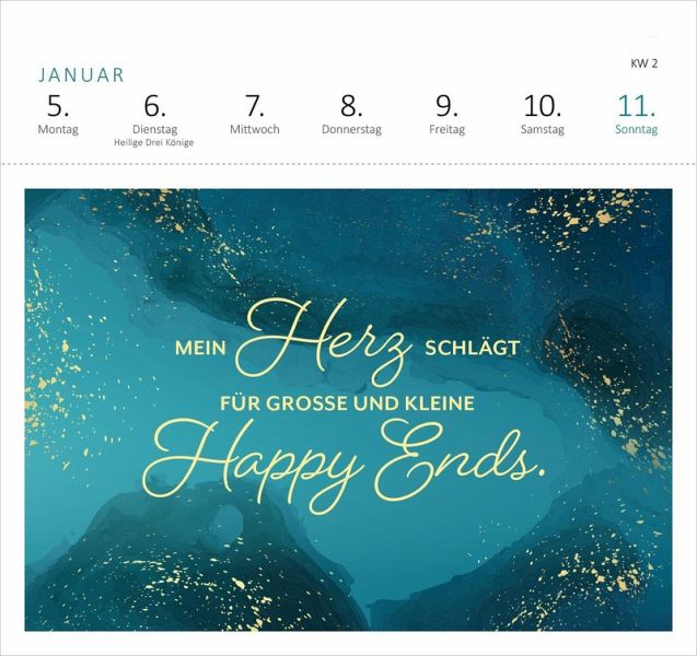 Ein tolles Geschenk für alle Romantiker und Booklover, die sich gerne von kleinen, liebevollen Botschaften inspirieren lassen. Dieser Kalender mit Postkarten begleitet mit den schönsten Liebeszitaten durch das Jahr. Mit dem praktischen Wochenkalendarium behältst du den Überblick, egal ob im Büro, Homeoffice oder zu Hause. Die Postkarten kannst du an der Perforation heraustrennen und verschicken. Der Stehkalender bietet jede Woche eine neue Möglichkeit, Liebe zu teilen - sei es als Dekoration oder als besondere Nachricht an deine Lieblingsmenschen.