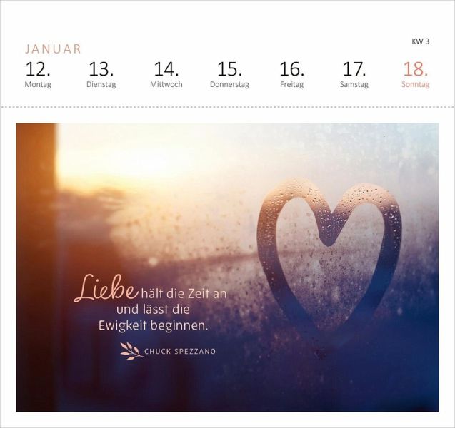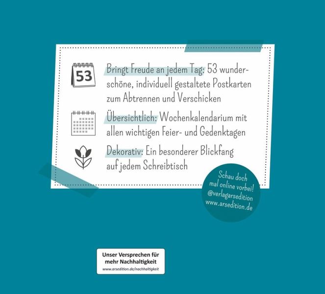 Ob Gelassenheit, Liebe, Freundschaft oder Hoffnung - die vielfältigen Zitate und Wünsche dieses Aufstellkalenders umfassen die großen und kleinen Themen des Lebens und schenken immer wieder neue Inspiration. Mit dem praktischen Wochenkalendarium behältst du stets den Überblick, egal ob im Büro, Homeoffice oder zu Hause. Die Postkarten mit stimmungsvollen Fotografien lassen sich an der Perforation heraustrennen und können so an liebe Menschen verschickt werden.